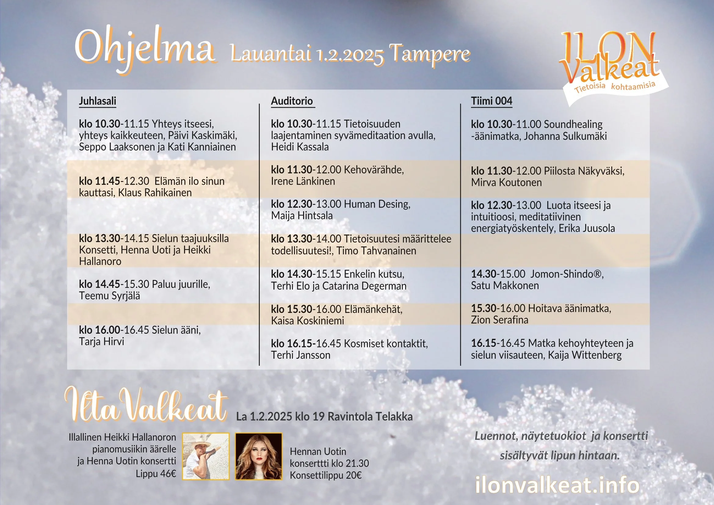 Ilon valkeat on monipuoliset ja lämminhenkiset hyvinvointimessut, jossa on mielenkiintoisia luentoja ja näytetuokioita. Mukana on paljon näytteilleasettajia eri aloilta.